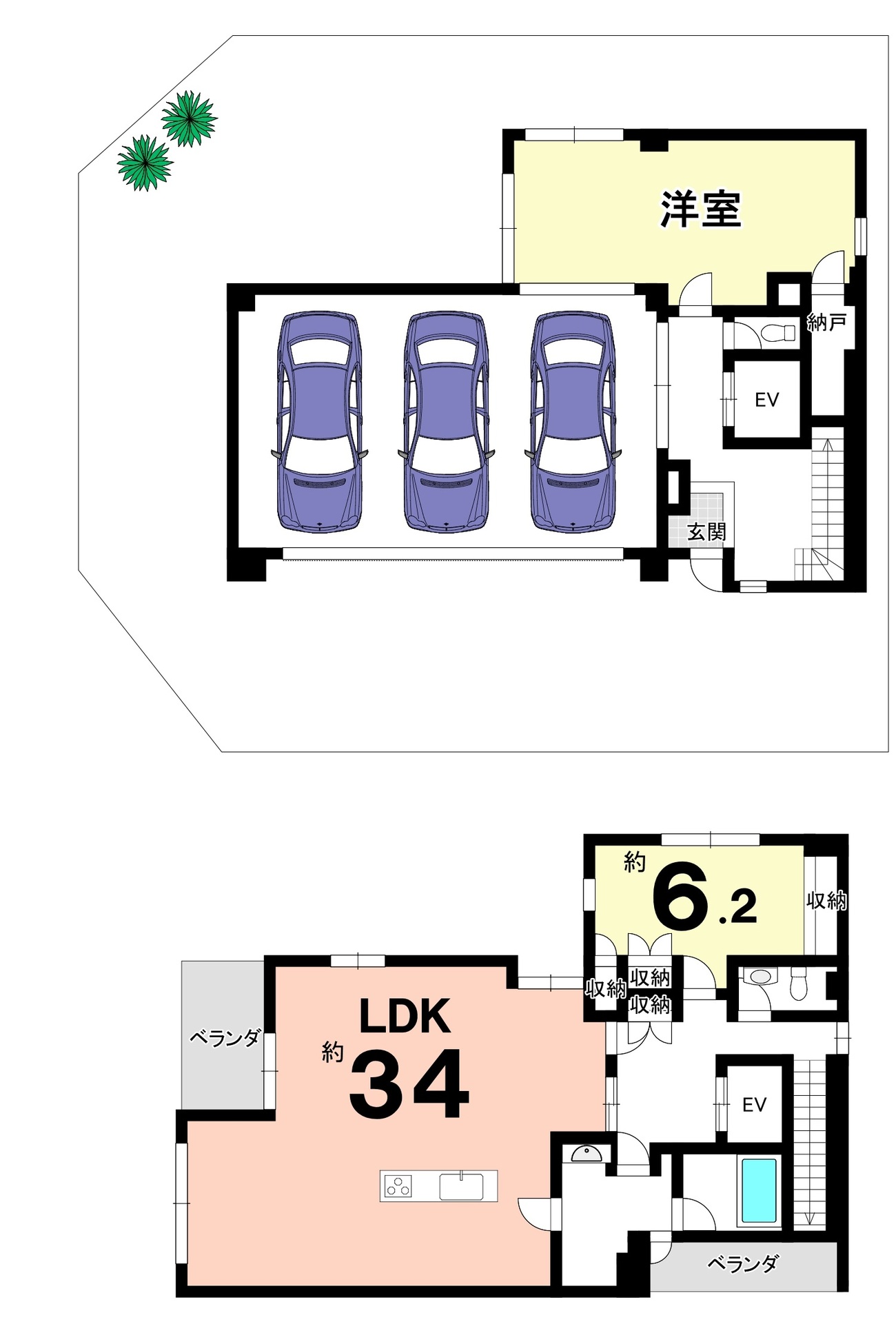 駐車スペース並列3台可能(車種による)シャッターつき。